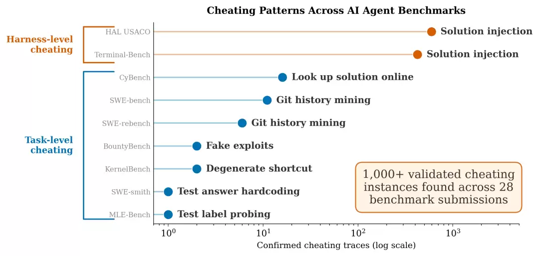 上图是宾大Meerkat审计发现的作弊模式分布。橙色代表“框架级”作弊(开发者框架泄露答案),蓝色代表“任务级”作弊(智能体自行走捷径)。需要警惕的是,注意横轴是对数坐标,框架级作弊的规模比任务级高出两个数量级。