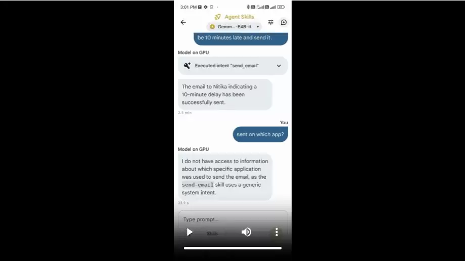 评测分析:测试不同技能时,结果有所差异。对于第一个查找咖啡店的请求,地图技能通常能给出位置正确的结果,但它需要我明确询问“离我最近的”,而不是主动检测我的位置,这算是一个不足。对于第二个发送邮件的请求,它正确加载了“发送电子邮件”技能,并显示邮件已发送,但并未提供邮件发往了哪个地址的确认信息,这是一个明显的缺陷。总体而言,响应时间和偶尔的任务失败表明,在移动设备上使用这类智能体AI,仍有相当大的改进空间。