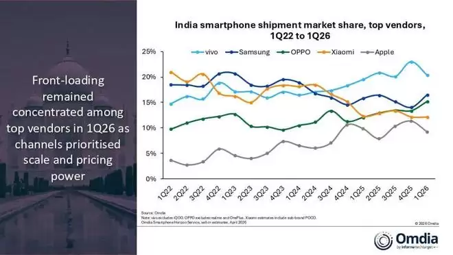 4月21日全球知名数据调研公司Omdia以“由于渠道谨慎和定价压力,2026 年第一季度印度智能手机出货量下降 5%”为标题对印度智能手机市场,第一季度的表现进行了分析。