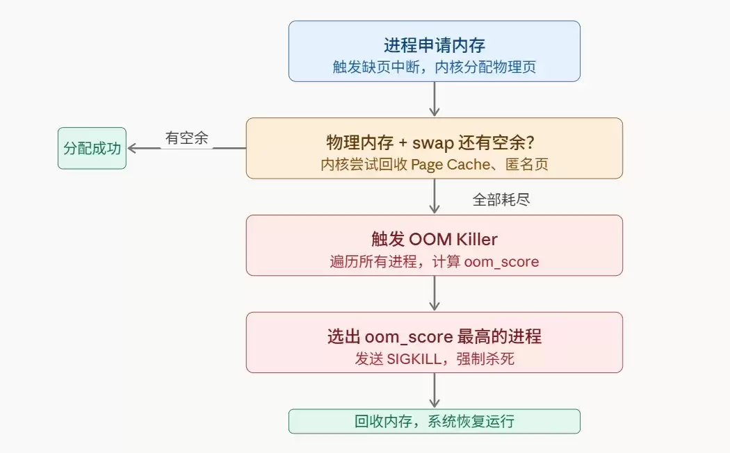 然而,一旦赌输了——所有进程都开始疯狂消耗内存,导致物理内存和交换空间(swap)全部告罄,内核就无路可退了。此时,只剩下最后的手段:杀掉一个或多个进程,回收内存。