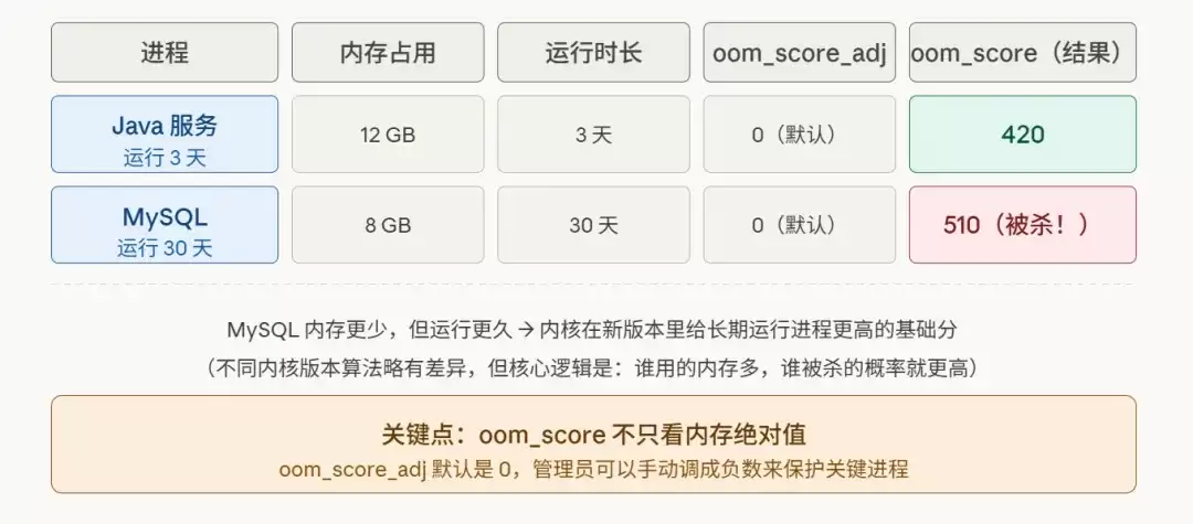 OOM Killer 的选择并非随机,也不单纯看内存大小。它会为每个进程计算一个oom_score,分数越高,“中奖”几率越大。