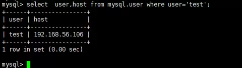 咱们先来还原一下这个经典场景。假设数据库服务器在192.168.56.102上,上面已经存在一个用户,用户名是test,但被严格绑定在了IP地址192.168.56.106上。也就是说,只有从这个特定IP发起的连接,才能用test账号登录。