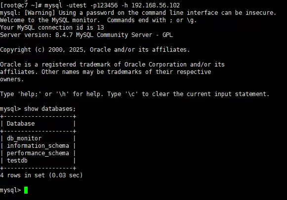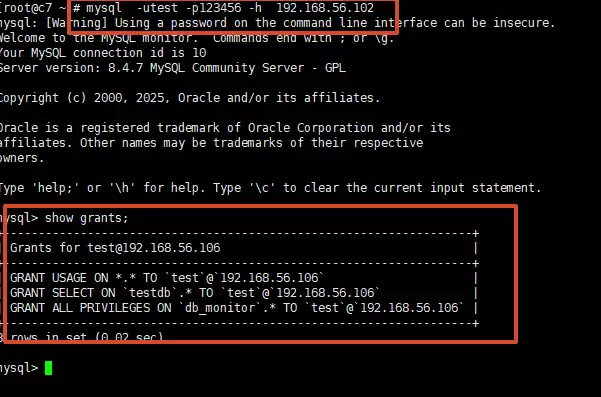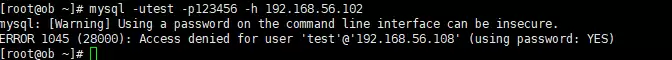 [root@ob ~]# mysql -utest -p123456 -h 192.168.56.102mysql: [Warning] Using a password on the command line interface can be insecure.ERROR 1045 (28000): Access denied for user 'test'@'192.168.56.108' (using password: YES)