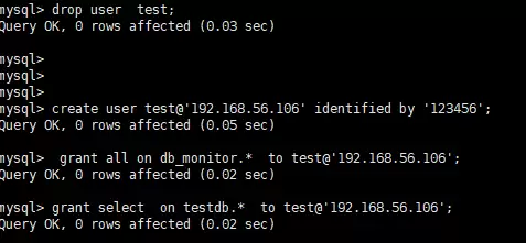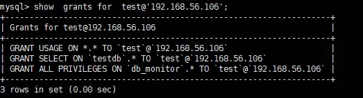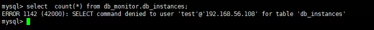 mysql> select count(*) from db_monitor.db_instances;ERROR 1142 (42000): SELECT command denied to user 'test'@'192.168.56.108' for table 'db_instances'mysql>