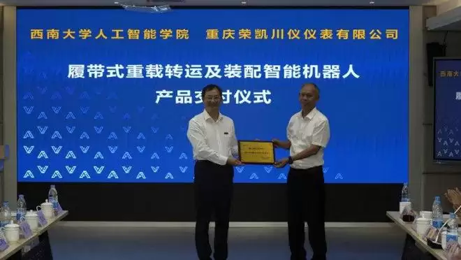 而发布会的精彩处,无疑是那份沉甸甸的“产品交付”。重庆荣凯川仪仪表有限公司董事长王德伟从人工智能学院院长段书凯手中,正式接过了“履带式重载转运及装配智能机器人”产品。这个简单的仪式,意义却非同小可。它标志着一项实验室里的科研成果,真正走出了校园,完成了产业化应用的关键一跃,也是校企协同创新模式迈出实质性一步的生动注脚。