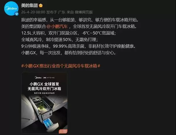 全球首款无菌风冷双开门车载冰箱问世,美的联手小鹏重新定义出行保鲜