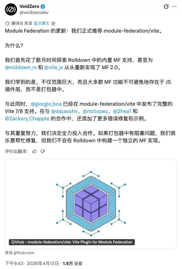 必须明确一点:Module Federation 的核心价值不在于打包器,而在于运行时。这恰恰解释了为什么官方最新的选择,不是在 Rolldown 里重写 MF,而是直接推进 @module-federation/vite。