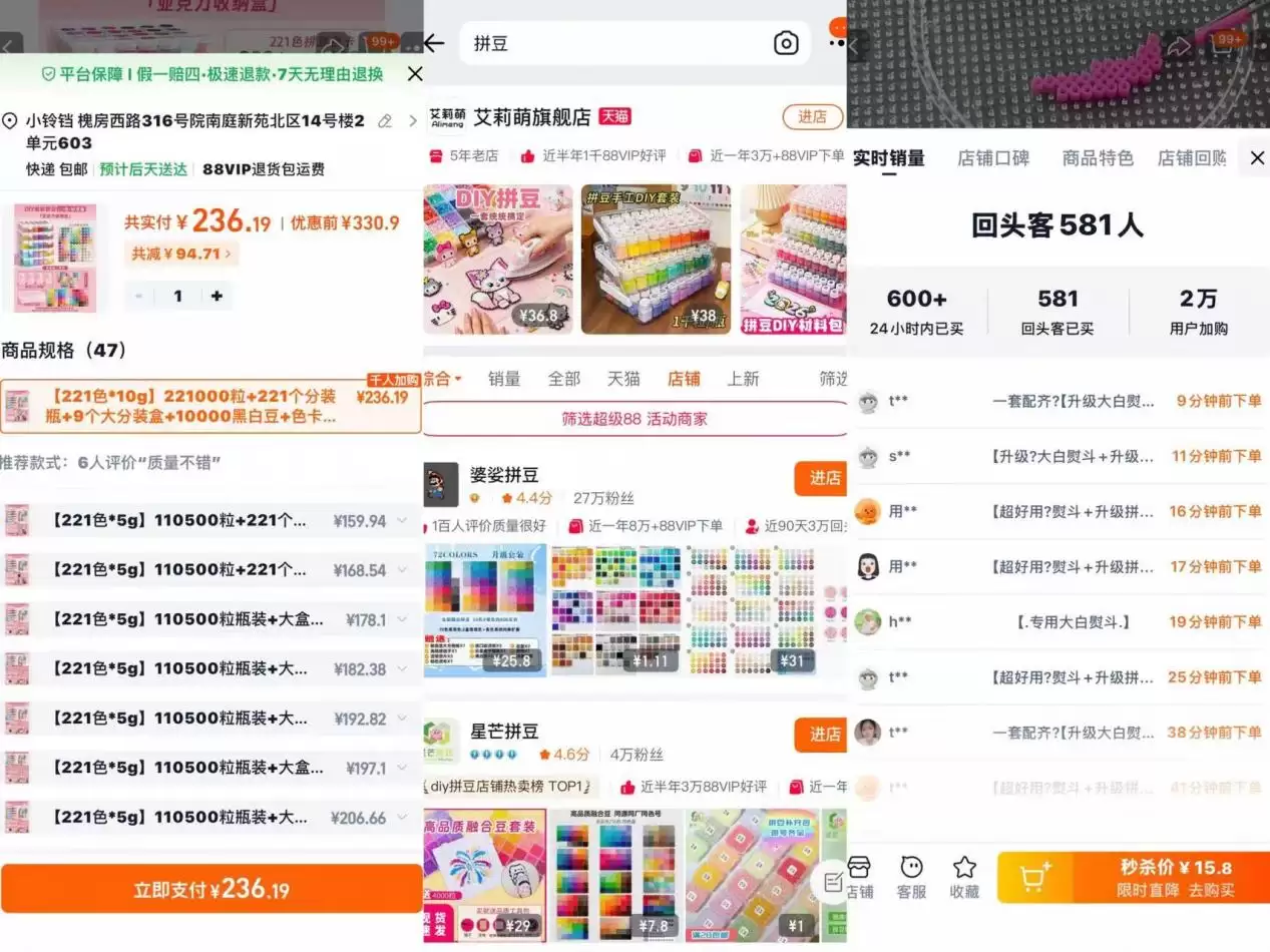 在淘宝搜索“拼豆”,结果多达数千家店铺。这个市场的规模虽难精确统计,但从几个侧面足以窥见其热度:头部店铺的材料包月销可达数万件;一套包含“全色号”的进阶套装,售价在100至300元区间;专业的拼豆熨斗、钉板等工具,也已形成独立的细分市场。