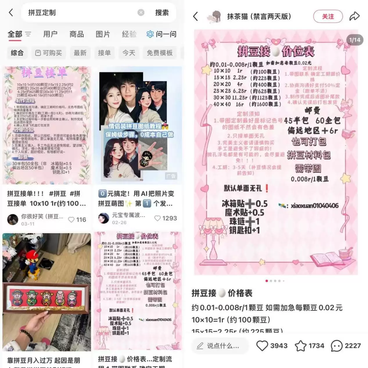 这种价值观的转变,也清晰地体现在拼豆的传播路径上。与传统依赖广告投放的商品不同,拼豆的流行几乎完全依靠UGC(用户生成内容)驱动。小红书上的分享笔记、B站上的教学视频、微信群里的作品展示,共同编织成一个自发的传播网络。在这里,消费者、创作者与传播者的身份边界,变得模糊。