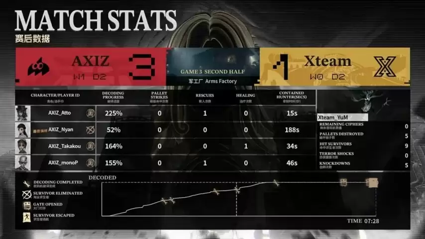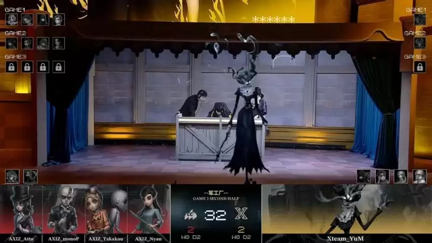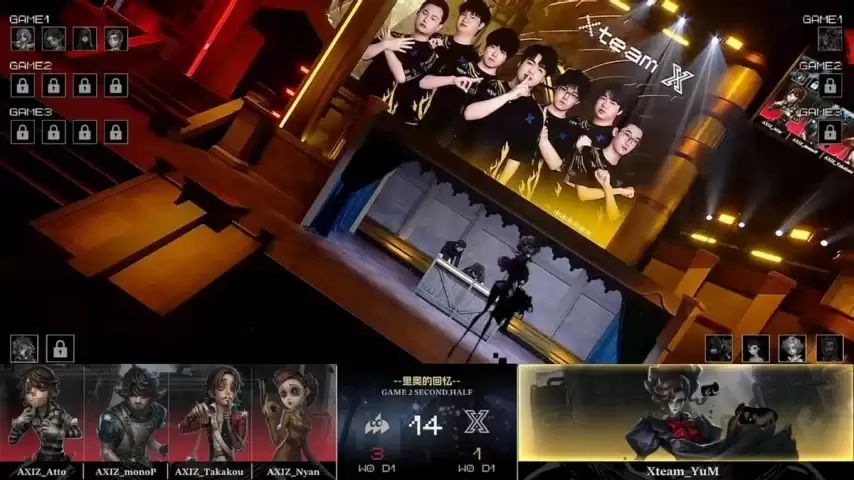 换边之后,AXIZ的求生者阵容为小说家、木偶师、佣兵和弓箭手;Xteam的监管者YuM同样以“跛脚羊”应对。(BAN位给到了医生、先知、魔术师和幸运儿)