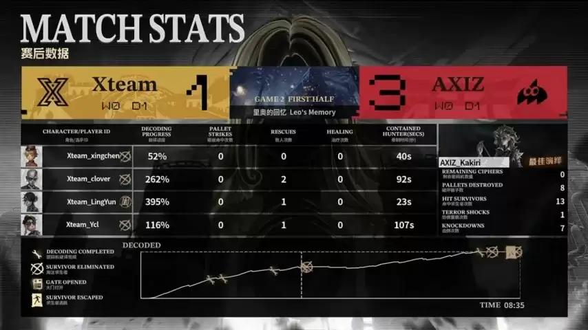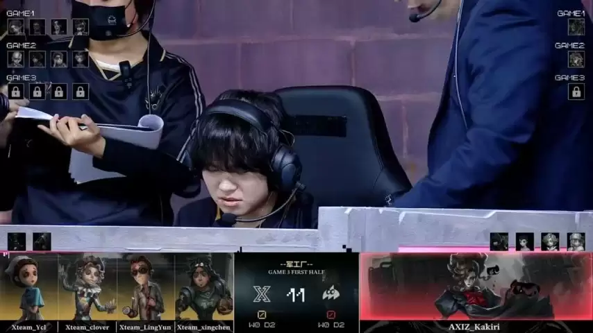 首局上半轮,Xteam在求生者方拿出了咒术师、木偶师、大副和调香师的组合;而AXIZ的监管者Kakiri则选择了“跛脚羊”迎战。(双方BAN位:先知、医生、守墓人、教授)