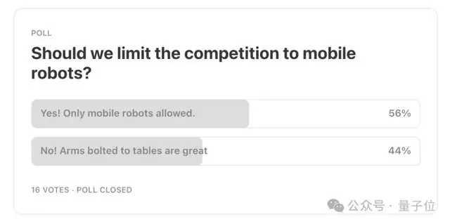 甚至,赛事创办人Benjie Holson对于是否允许“手臂固定在桌面上”的机器人参赛都拿不准,最终将决定权交给了网友投票。结果显而易见:只允许可移动的机器人参赛。这意味着,难度又提升了一个量级。