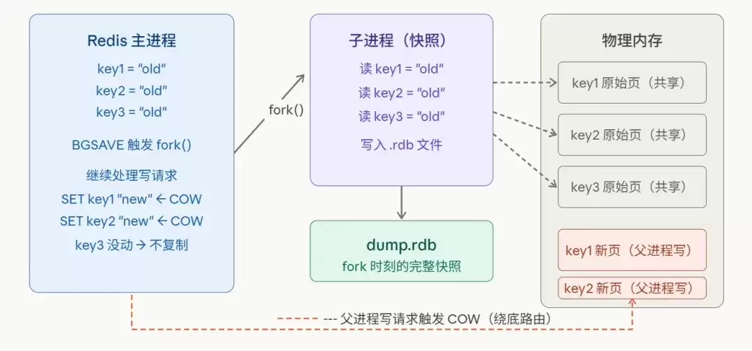 让我们再梳理一下整个链条:fork()的瞬间完成,得益于父子进程初始时对物理内存的共享;父进程后续的写操作,会按需触发内存页的复制;而内存的额外消耗,则与快照期间的写操作量线性相关。