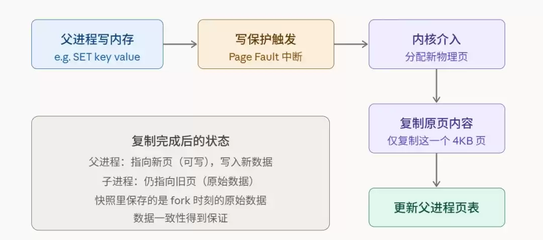 SET命令)时,就会触发一次COW,内核会为该页创建一个副本供父进程修改。