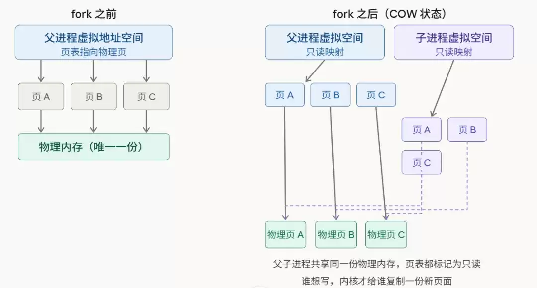 这里的关键在于,COW的粒度是内存页(通常4KB),而非整个进程地址空间。每次写操作,最多只复制一个被修改的页面。