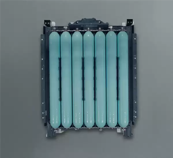 技术细节方面,这套存储系统的核心由七个高压碳纤维复合材料储氢罐构成。它们以并联方式,被紧凑地集成在一个坚固的金属框架内。真正的创新点在于结构设计:系统并非采用多个完全独立的压力容器,而是通过相互连通的七个腔体,形成了一个封闭的整体。这种一体化设计,仅需一个中央主阀进行统一控制,使得整个系统的管理逻辑大为简化,可靠性也相应提升。