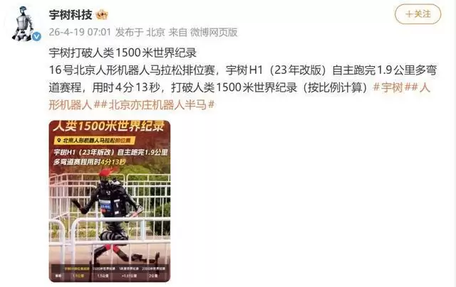 其实,就在同一天稍早时候,宇树科技官方还发布了一条振奋人心的消息。在16日举行的北京人形机器人马拉松排位赛上,宇树H1(2024年改版)自主跑完了1.9公里多弯道的复杂赛程,用时仅为4分13秒。如果按比例折算,这个速度甚至已经打破了人类1500米的世界纪录。这一对比,恰恰揭示了前沿技术探索过程中的典型特征:突破与挑战并存,高光时刻与突发状况往往只有一线之隔。