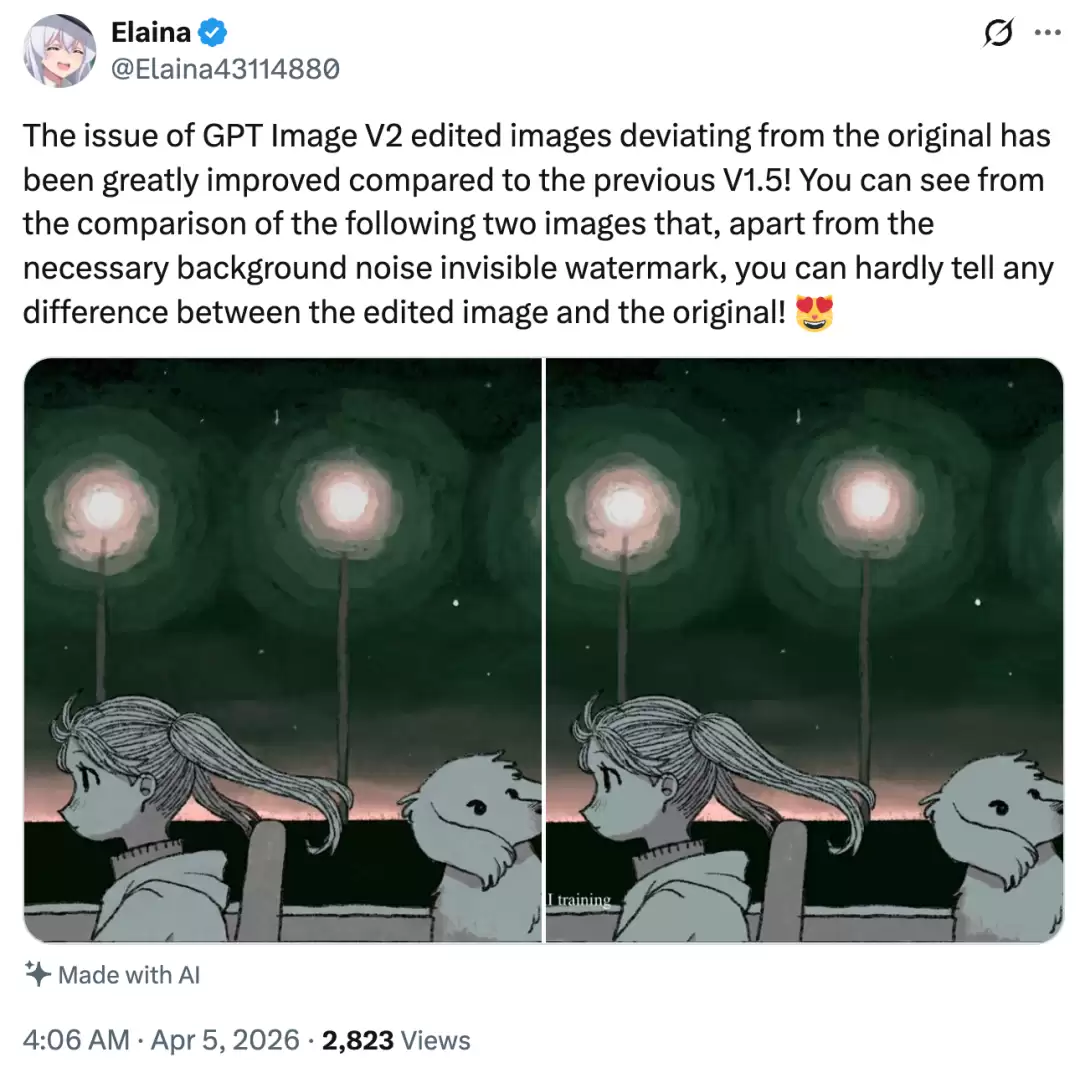 在图像编辑的一致性上,改进也相当明显。“相比前代V1.5,GPT-Image-2在编辑过程中间出现偏离原图的问题已经显著改善。从对比图可以清晰看到,除了为版权保护而添加的、肉眼不可见的背景噪声水印,编辑后的图像与原图几乎没有任何可察觉的差异。”