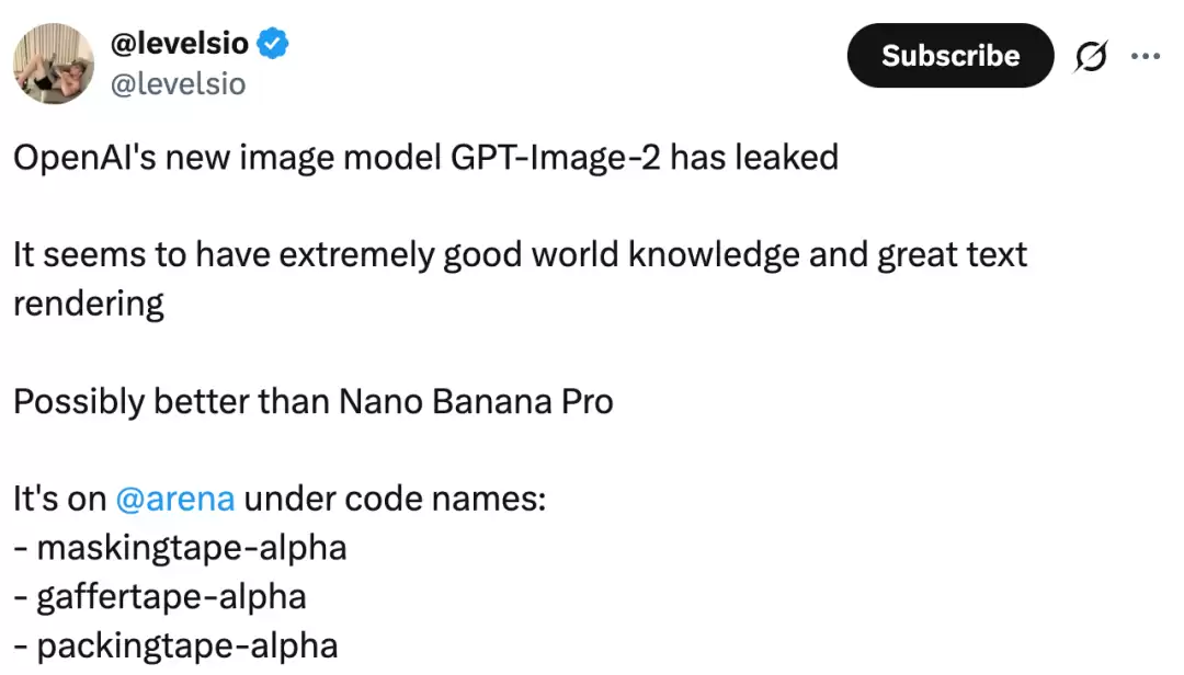 根据目前流出的更多信息,这款疑似GPT-Image-2的模型,曾在测试平台上使用过「maskingtape-alpha」、「gaffertape-alpha」和「packingtape-alpha」这几个充满“胶带”特色的代号。除了前面提到的惊人文字渲染力,它在世界知识理解方面的表现也相当突出。从一些测试结果看,其整体水平或许已经对谷歌的Nano Banana Pro构成了实质性挑战。