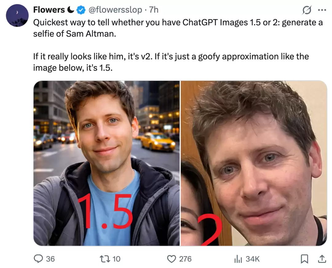 甚至出现了一些有趣的“民间鉴定法”。比如:“观察山姆·奥特曼的自拍图,如果生成结果看起来真的非常像他本人,那基本可以确定是Image-2;如果只是有些滑稽的粗略模仿,那大概率还是老的Image-1.5。” 从流出的对比图来看,社区的判断不无道理。