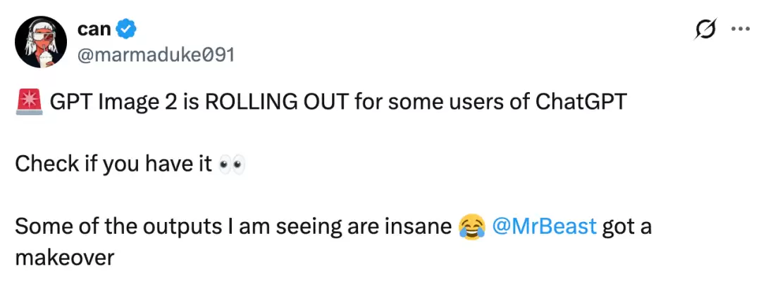 除了在竞技场的集中测试,迹象表明,GPT-Image-2似乎已经开始向一部分ChatGPT用户进行小范围的灰度测试。