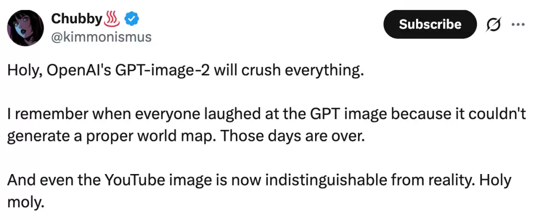 社区里的反应相当热烈。有用户直接感叹道:“天哪,OpenAI的GPT-Image-2简直要碾压一切了。还记得以前吗?大家几乎都在嘲笑GPT的图像模型,因为它连一张准确的世界地图都画不出来。但现在,那个时代似乎真的过去了。眼下,它生成的YouTube风格界面图片,几乎已经达到了以假乱真的地步。这进步幅度,确实有些夸张。”