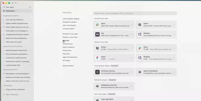 通过Cursor应用市场,用户可以一键安装数百款基于MCP、Skill或子Agent的插件。此次Cursor 3为Atlassian、Datadog、GitLab、Hugging Face 等平台新增了超过30个官方插件。此外,它还支持企业搭建私有的插件应用市场,以满足团队内部特定的开发需求。