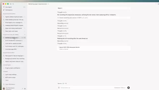 所有正在运行的Agent会话都会清晰地排列在左侧边栏中,并支持以并排或网格模式同时查看,一目了然。更重要的是,这些Agent能够跨越不同的代码仓库进行协同工作。云端智能体在完成任务后,还会自动生成工作成果的演示和截图,方便用户快速确认,这个功能已经无缝集成到了桌面应用中。