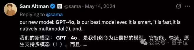 时间回到2024年5月,4o正式诞生。和所有备受瞩目的新模型一样,它问世之初便享受了最高规格的礼遇。萨姆·奥特曼将几乎所有溢美之词都给了这位新成员,如同一位自豪的家长,向全世界宣告: