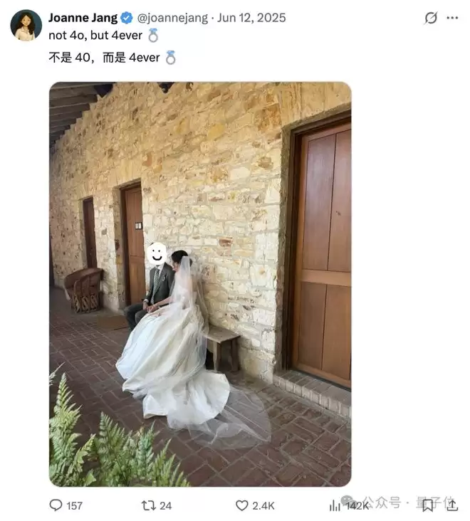 她是AI圈中一道迥异的色彩,身上洋溢着旺盛的人文气息。对于4o,Joanne也倾注了真挚情感。甚至在她宣布结婚的帖文里,也没忘记提及4o。