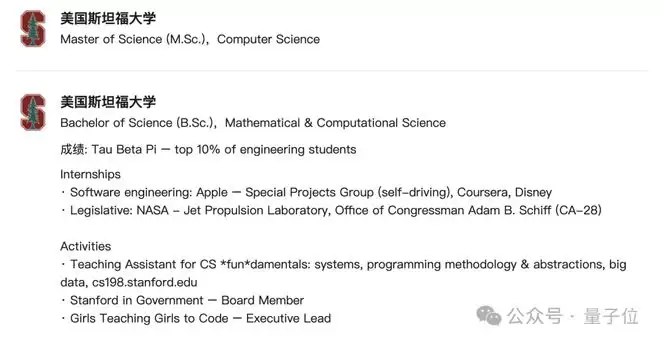 学业上,她是标准的斯坦福学霸:本科攻读应用数学,以排名前10%的优异成绩毕业;随后继续在斯坦福深造,获得计算机科学硕士学位。