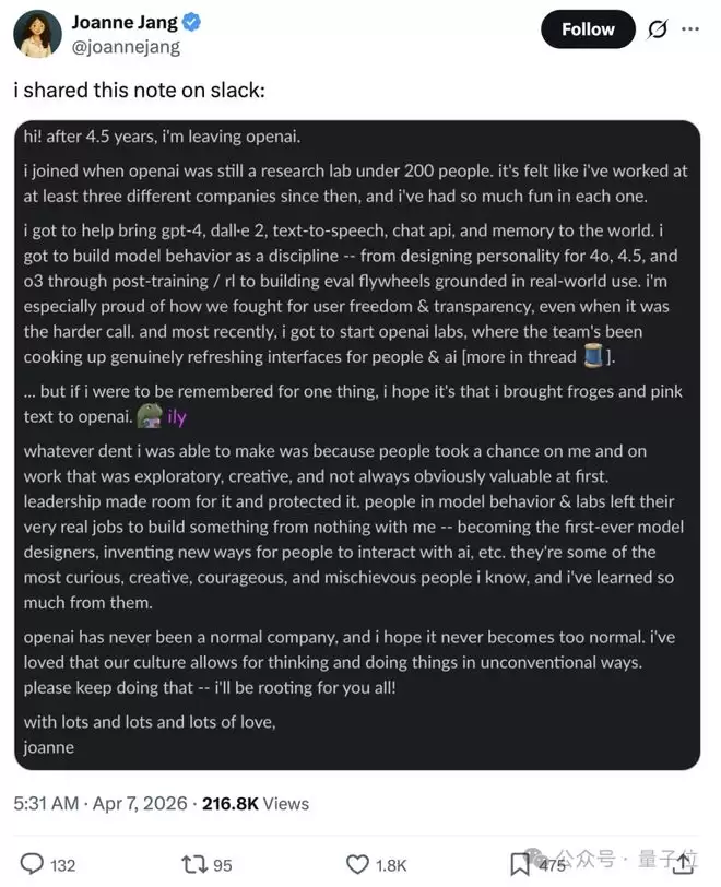 刚刚,一个消息在AI圈内悄然传开:被誉为“4o之母”的Joanne Jang发布了一篇长文,正式结束了自己在OpenAI长达四年半的旅程。