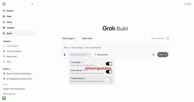 功能上的创新点同样引人注目。据悉,Grok Build 预计会引入 Parallel(并行)模式和 Arena(竞技场)模式。其中,Arena 模式尤其有趣,它允许用户让多个智能体同时处理同一项任务,最终可以从多个结果中挑选最优解。这相当于将“群体智慧”和“对比择优”的思路引入了编程辅助过程。
