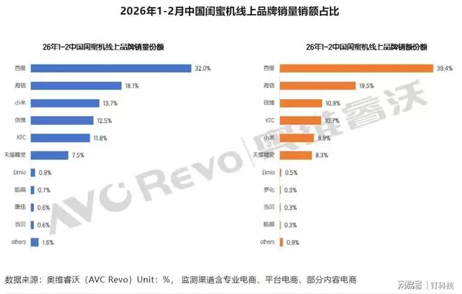 然而,市场从来不相信永恒的王者。来到2026年的头两个月,线上销量份额画风突变。百度的份额下滑到了32%,虽然仍居第一,但9个百分点的跌幅不容小觑。同样失意的还有天猫精灵,份额从10%跌出前五。与它们一同退潮的,还有一批早期依靠低价策略冲量的白牌厂商。