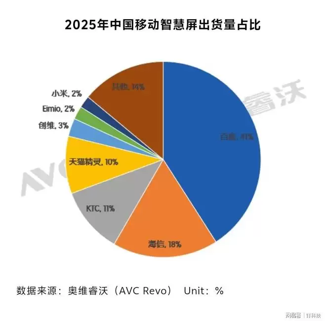 先来看看品牌格局的戏剧性变化。如果把时间拉回到2025年,百度可以说是一枝独秀,占据了整个移动智慧屏市场41%的出货量。海信以18%的份额位居第二,之后是KTC(11%)、天猫精灵(10%),而创维和小米的份额当时还比较小,分别只有3%和2%。