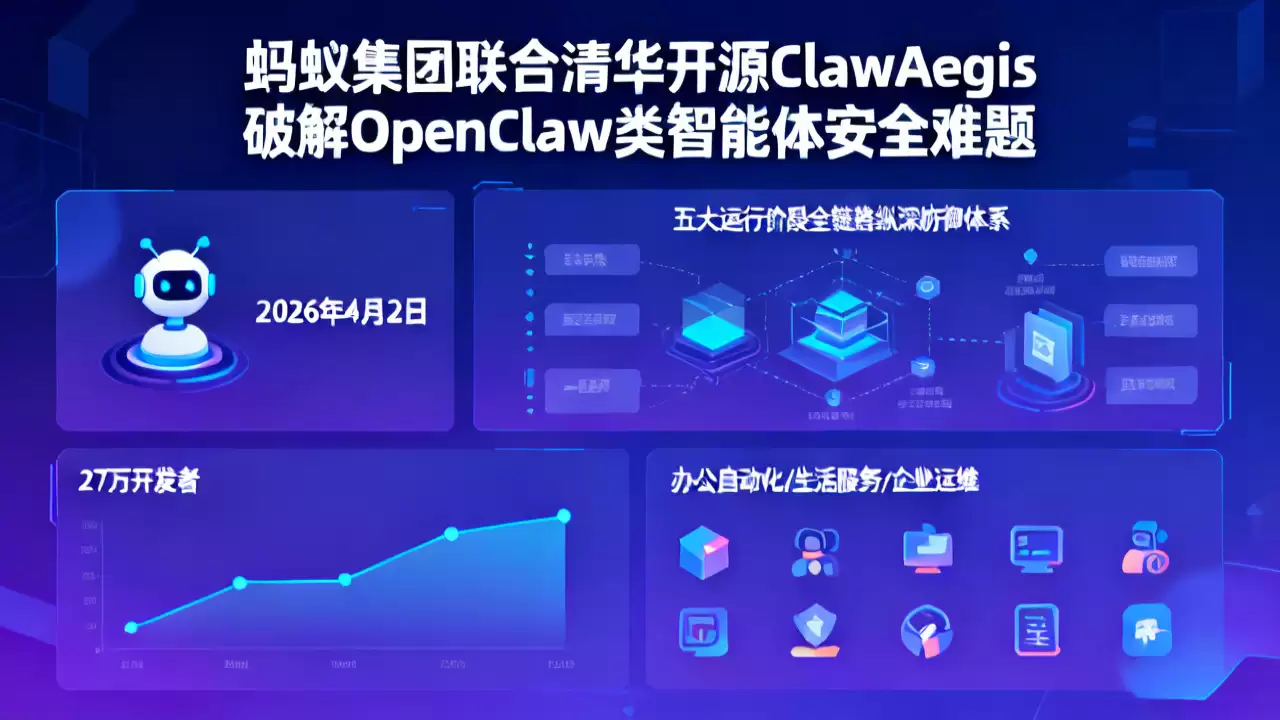 2026年4月2日,智能体安全领域迎来了一项关键进展。蚂蚁集团AI安全实验室与清华大学联合宣布,正式开源智能体安全防御插件——ClawAegis。这个产品来头不小,它是全球第一个覆盖OpenClaw全生命周期的安全防护工具。其核心在于构建了一套覆盖五大运行阶段的全链路纵深防御体系,能为自主智能体提供多维度、轻量化且能即时干预的原生防护能力。可以说,它系统性地瞄准了OpenClaw这类框架普及过程中暴露出的各类安全隐患。