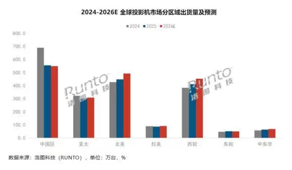 将目光聚焦到区域市场,格局的变化尤为值得关注。数据显示,2025年中国大陆投影机市场出货量为555.5万台,同比出现了19.4%的显著下滑。这一调整使得其全球市场份额降至三成以下。尽管如此,中国作为全球最大单一市场的地位依然稳固。不过,市场预测认为,2026年中国市场的规模可能还将经历小幅回调,预计降至549万台。