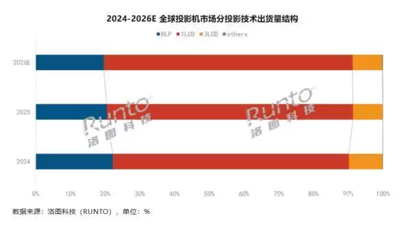 从技术路线的竞争格局来看,市场分化同样明显。2025年,1LCD技术产品全球出货量高达1362万台,其市场份额从2024年的67.9%进一步提升至70.9%,主导地位得到加强。反观DLP技术产品,2025年出货量为392.6万台,同比下滑12.5%。而3LCD技术的市场份额则持续收索至8.5%,对应出货量为163.8万台。这组数据清晰地告诉我们,在成本与性能的平衡中,市场正在做出它的选择。