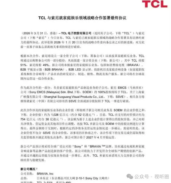 一则重磅消息,为全球电视产业投下了一枚震撼弹。经过两个月的战略磋商,TCL电子控股与索尼集团在3月31日正式签署了最终协议。这笔总价值约1028亿日元(折合52亿港元)的交易,其核心在于:TCL将以约754亿日元(约38亿港元)的对价,获得新合资公司51%的控股权,索尼则持有剩余的49%。新公司定名为BRA VIA, Inc.,总部依然设在日本东京。