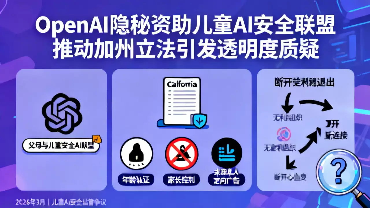 2026年3月,一个名为“父母与儿童安全AI联盟”的组织悄然成立,并迅速开始推动加州在儿童AI安全领域的立法进程。该联盟倡导年龄验证、家长控制、禁止针对未成年人的定向AI广告等监管规则,立场看起来无可指摘。然而,鲜为人知的是,其全部启动资金均来自头部AI企业OpenAI,且这一出资方身份在联盟的对外活动中从未被公开披露。随着真相被媒体挖出,多家此前加入的儿童安全非营利组织因信息不透明而选择退出,事件随即在行业内引爆了一场关于AI企业干预监管立法透明度的广泛讨论。