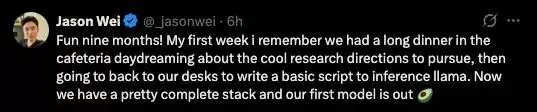 Jason Wei的回忆则充满了画面感:“第一周,我们在食堂进行了一次漫长的晚餐,畅想研究方向,然后回到桌前写了一个基本的推理脚本。如今,我们拥有了一套相当完整的技术栈,并且发布了第一个模型。”