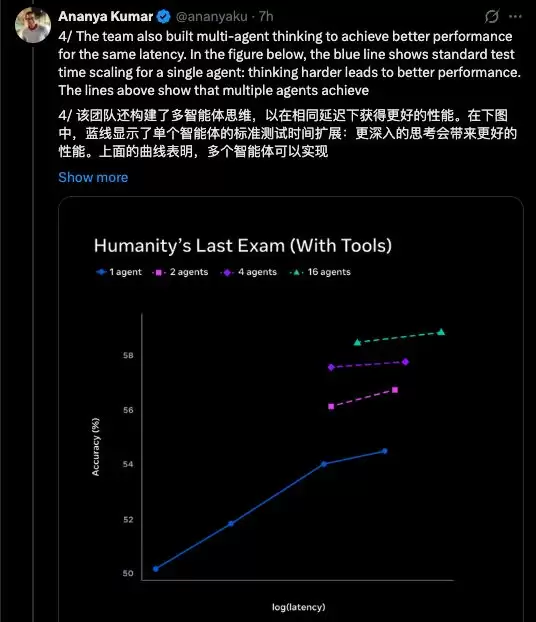 Ananya展示的另一组图表揭示了多智能体推理的关键洞察:多个智能体并行推理,在相同时间延迟下,能达到比单智能体更高的性能。换句话说,沉思模式不仅仅是“让模型想得更久”,更是“让多个模型同时思考不同方面”。
