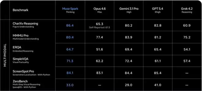 这些数据表明,Muse Spark在需要深度视觉理解的医疗多模态和科研图表领域,已建立起断档式的领先优势,在代码工程上也跻身第一梯队。但其综合能力与纯文本高级推理方面,与顶尖模型尚有差距。