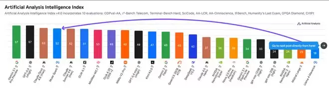 然而,在综合性的Artificial Analysis智能指数上,Muse Spark得分为52分,仍落后于GPT-5.4和Gemini 3.1 Pro的57分。