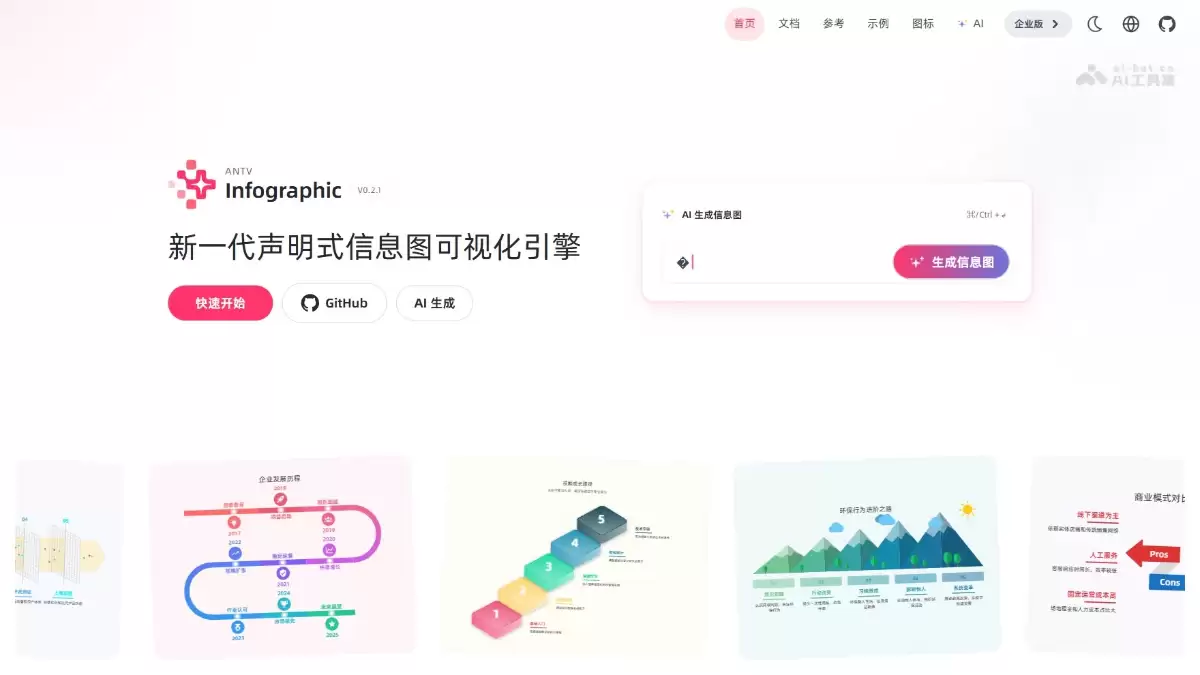 - 项目官网:https://infographic.antv.vision/ 这里提供了完整的文档、教程和交互式示例,是首要的学习站点。