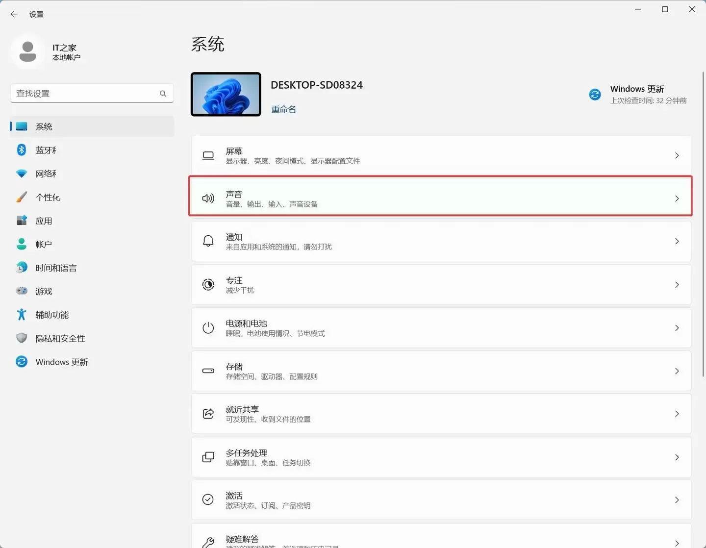 2. 进入设置后,在左侧的菜单栏里,找到并点击“系统”,然后在右侧选项中选择“声音”。