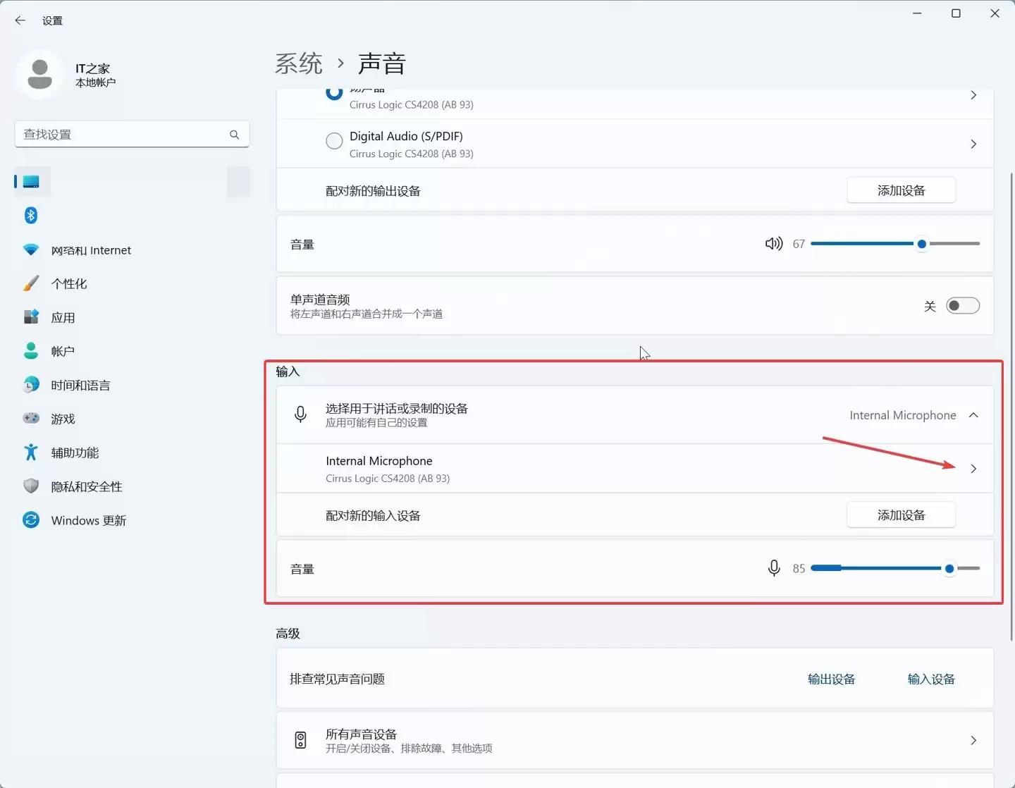 3. 接着,在声音设置页面中向下滚动,你会看到一个专门的“麦克风”分区,点击它进入详细设置。