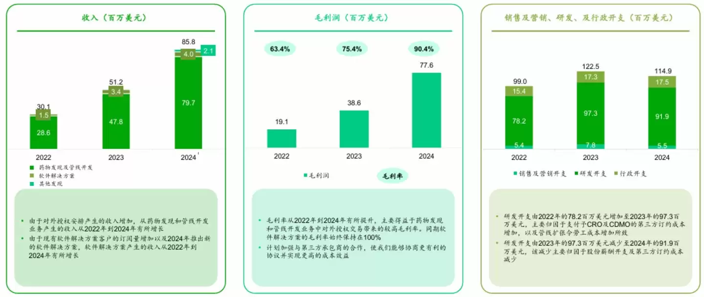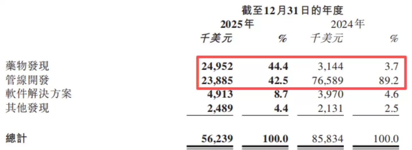 拆分收入结构可以发现,2025年,英矽智能有44.4%的收入来自药物发现服务,42.5%的收入来自管线开发合作;而在2024年,这两项业务的收入贡献比分别为3.7%和89.2%。两年间的对比,形成了药研核心业务平衡发展、共同稳定营收的局面;而其底层的AI服务则在稳步增长,并不断开拓新的应用场景。