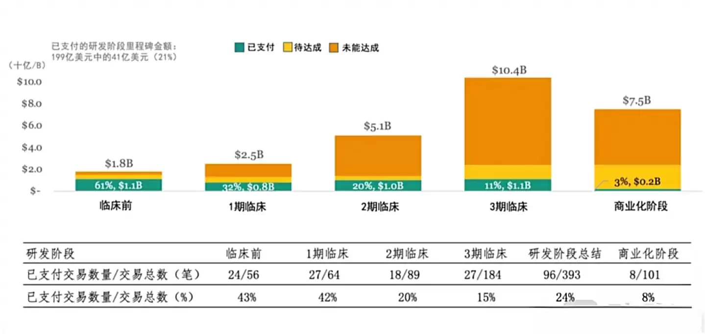 美国调研机构SRS Acquiom的数据揭示了一个现实:过去9年全球生物制药BD交易中,超过60%的里程碑未能达成。仅看2024年,里程碑达成率也仅为22%,而且临床阶段越往后,兑现概率越低。最终实际落地的里程碑资金,通常只占交易总额的3%左右。