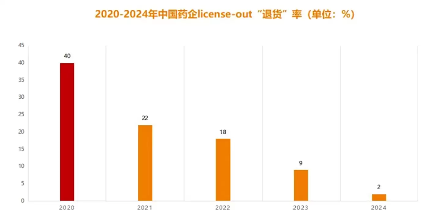 2020-2024年中国药企licence-out“退货”率,图源:动脉网